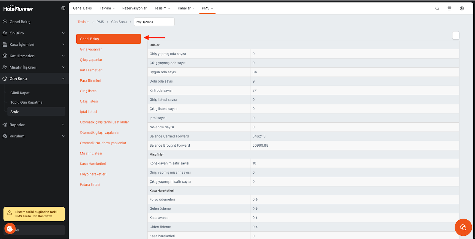 This is not only specific to HotelRunner PMS but also a standard practice across all PMS (Property Management System) solutions in the hospitality industry. Once the day is closed, the system locks all transactions for that date and generates a standard report set covering all operations of that day.
