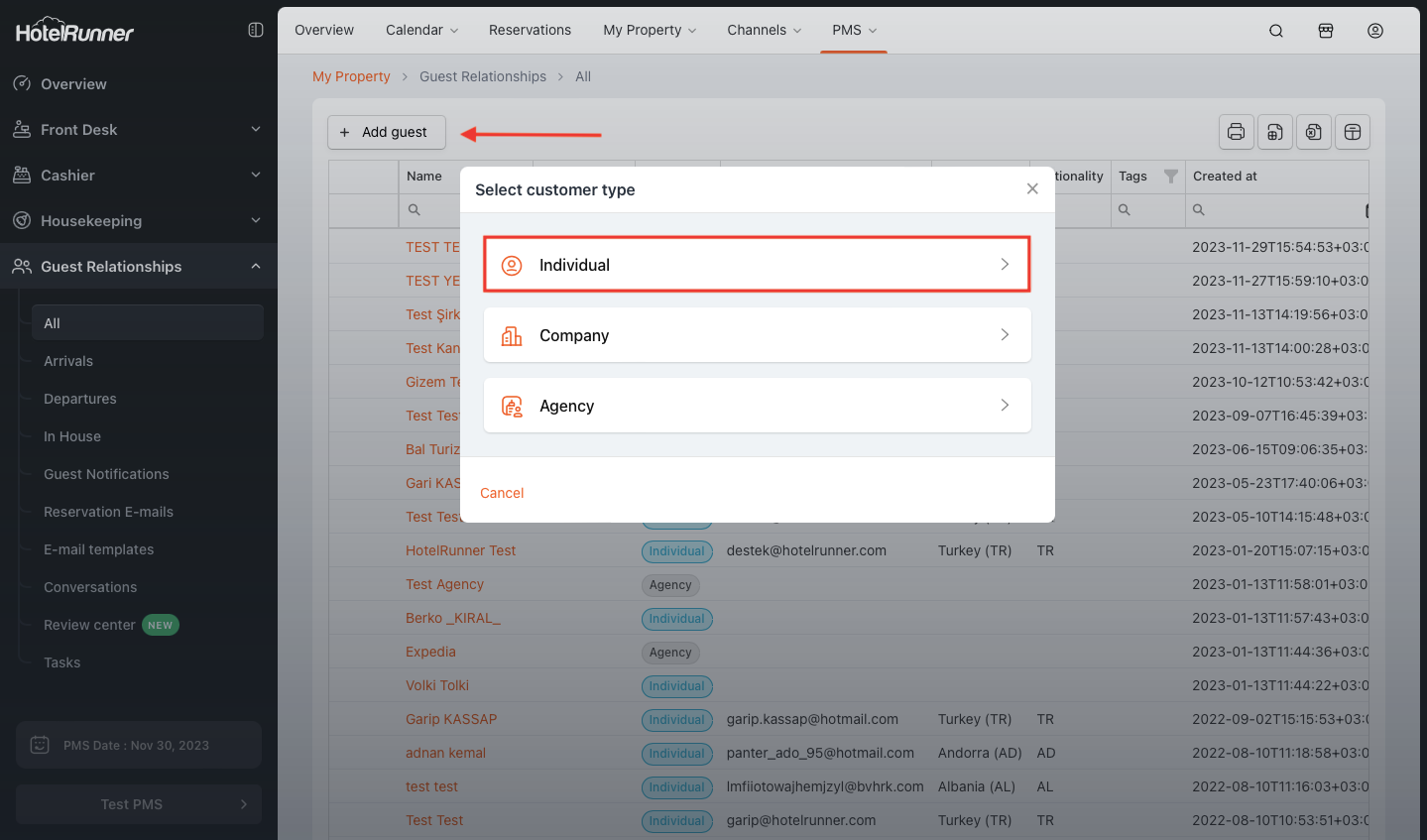 You can view and edit all profiles created on HotelRunner PMS by navigating to PMS > Guest Relations > All. Additionally, you can add a new profile independently of any reservations.