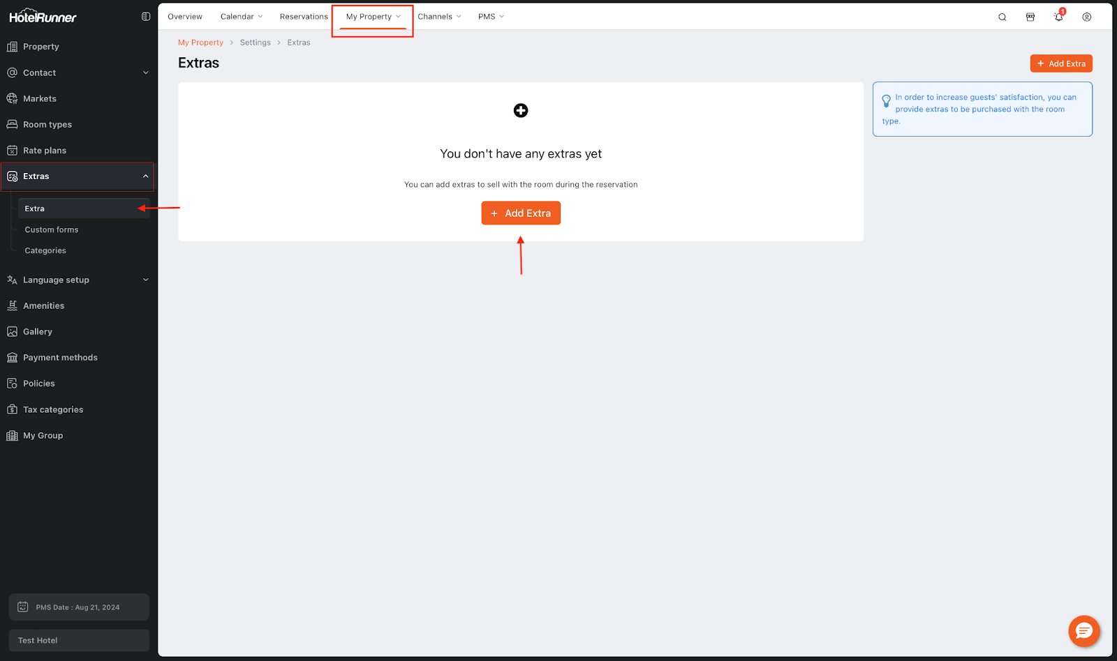 • Open the My Property > Settings > Extras > Extra screen and click the Add Extra button.