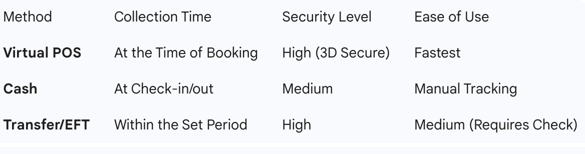 Process: Payment is transferred directly to the hotel’s bank account or intermediary payment institution (Iyzico, Stripe, PayTR, etc.).