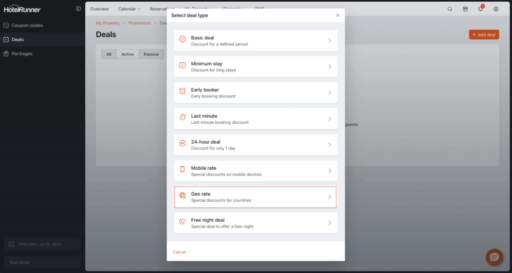 To add a Geo Rate Deal to the HotelRunner panel, follow the steps below:
