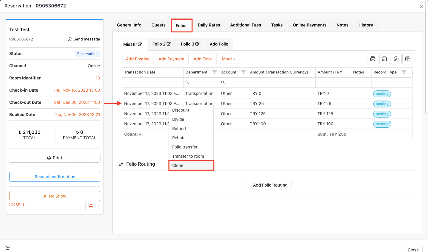 To duplicate a posting or a payment exactly as it is posted on a guest’s account, you can use the Clone option.