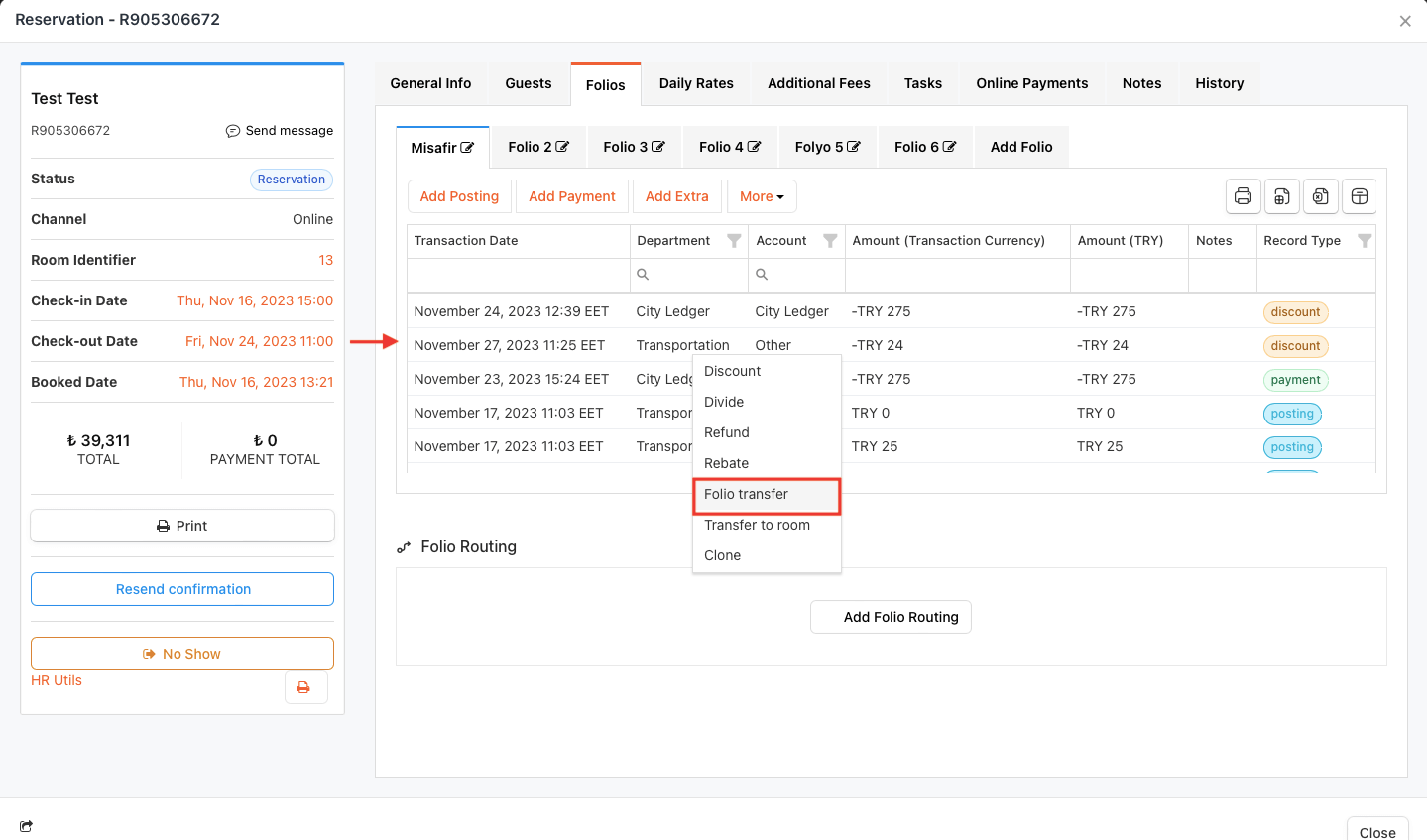 You can use the Folio transfer option to move a posting or a payment to a guest’s account from the current folio to a different folio created within the same reservation.