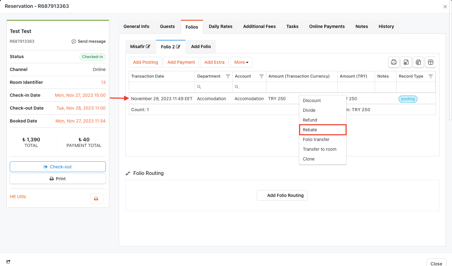 🔔 Note: Please note that if there are multiple transactions on the folio screen, it is advisable to transfer the transactions to a new folio for clarity before processing the rebate. For instructions on how to perform folio transfers, please refer to the How to Use the Folio Transfer Option on the Folio Screen document.