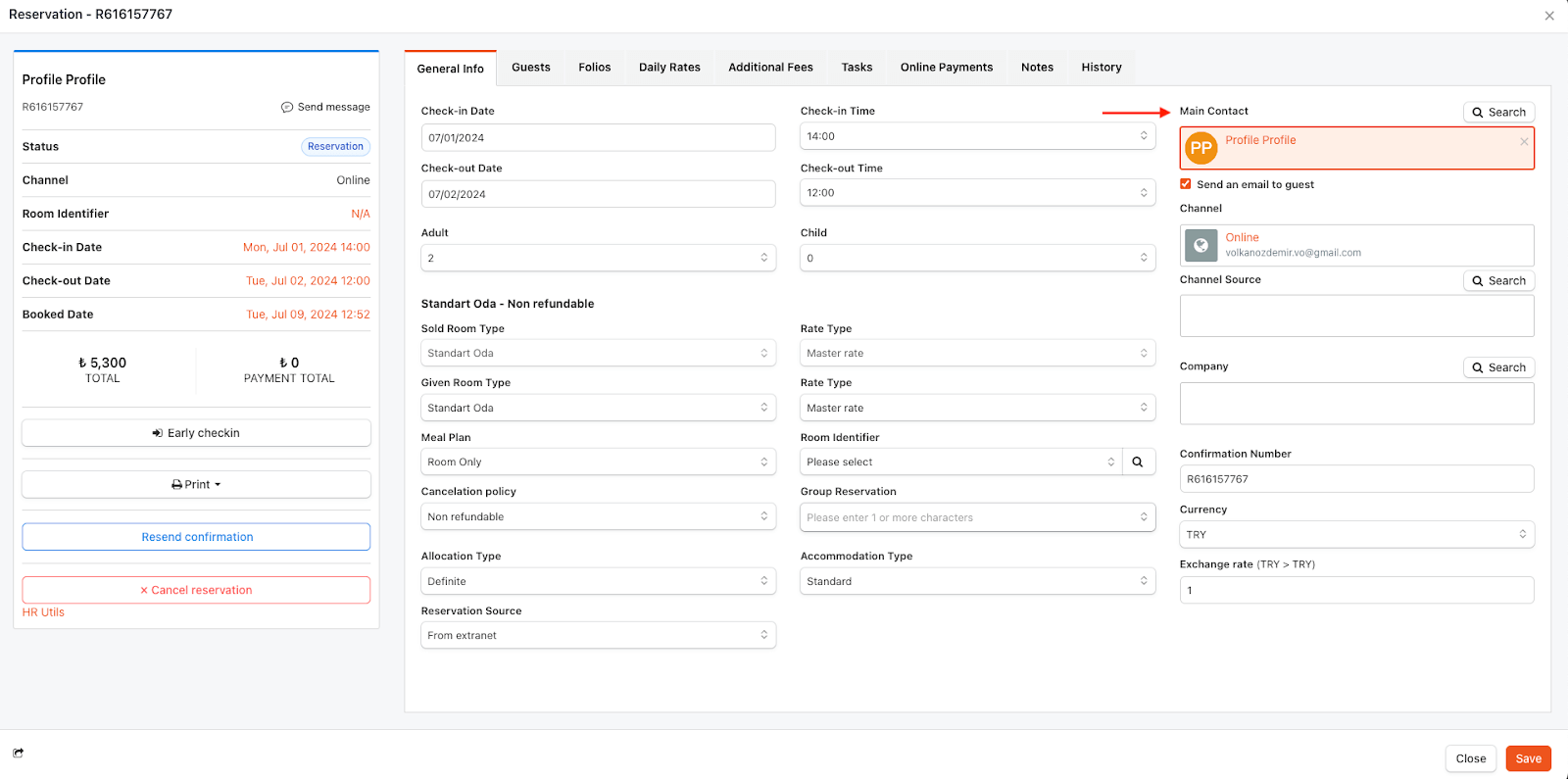 - Complete the Main Contact change by clicking the Save button on the reservation screen.