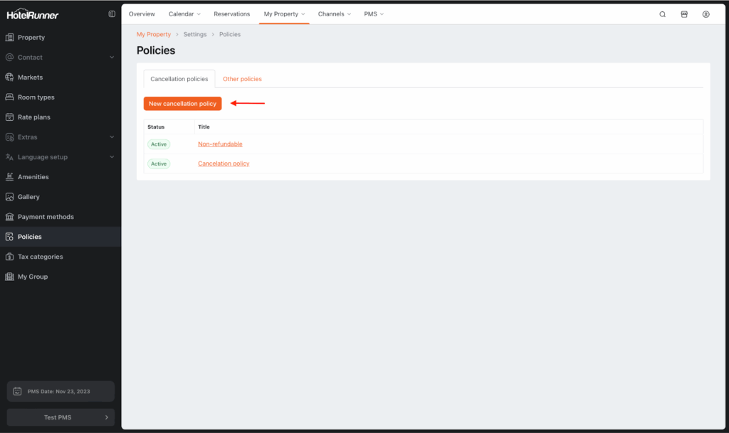 - Navigate to My Property > Settings > Policies > Cancellation Policies.