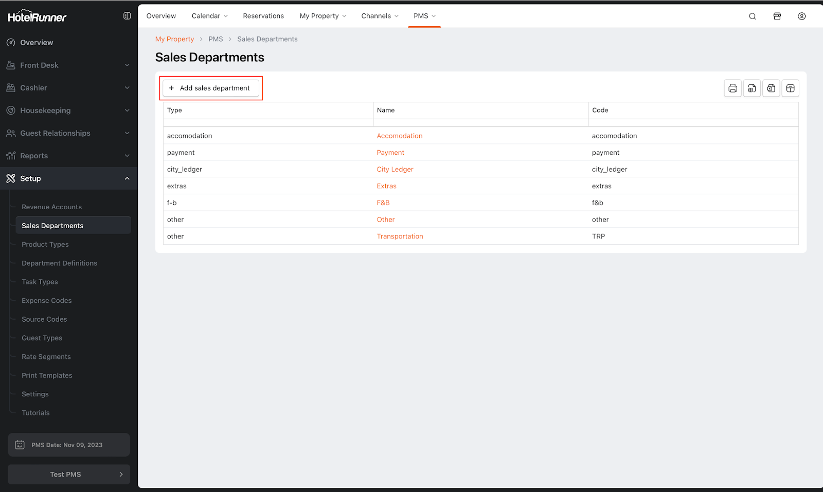 The Sales Departments section in HotelRunner PMS is a pivotal feature designed for the categorization and management of revenue items generated through various operational activities. This section plays a crucial role in organizing revenue streams by departmental divisions, which enhances the accuracy and clarity of financial tracking and reporting. By segmenting revenue according to specific departments, you can ensure that each revenue item is properly allocated, facilitating a more detailed and structured analysis of financial performance.