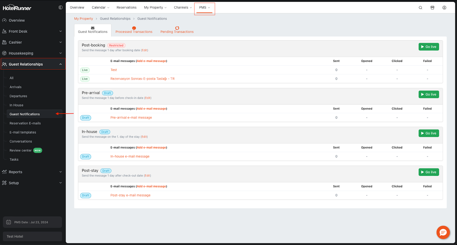 - Access: To access this section, navigate to PMS > Guest Relations > Guest Notifications.