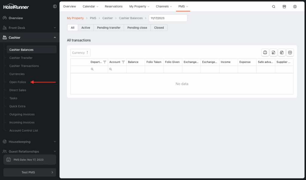 - To access open folios, you can navigate to PMS > Cashier > Open Folios.