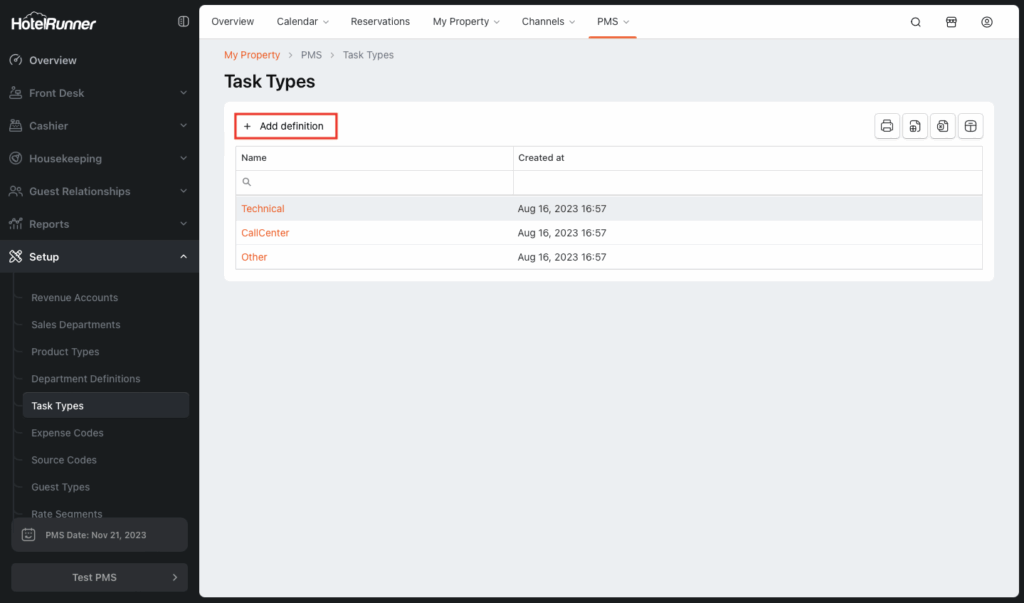 You can access the Task Types screen from PMS > Setup > Task Types.