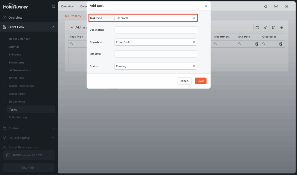 🔔 Note: In the new task assignment operations you will perform through PMS > Front Office > Tasks, the task types you created in the Task Types field will appear in the task type selection phase.