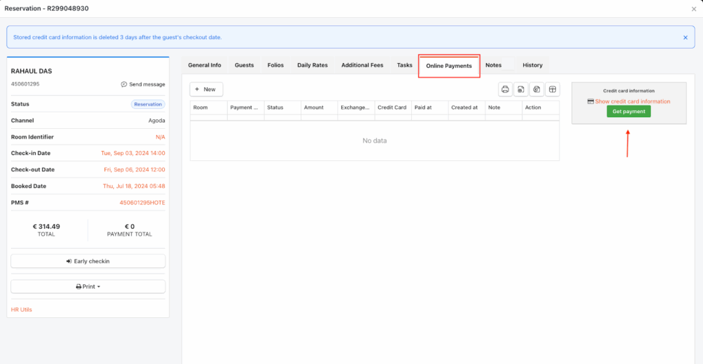 You can view the payment method of the OTA reservation and the defined credit card information, if any, in the Online Payments tab.