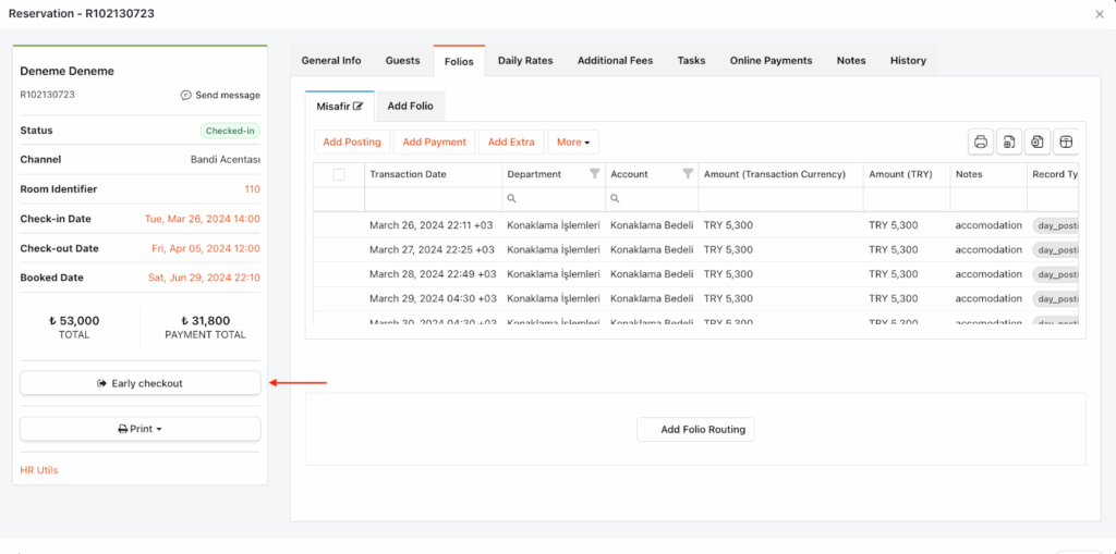 Access the folios screen of the reservation that will be checked out early, and enter the payment details according to the payment method received from the guest.
