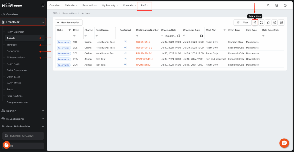 Navigate to PMS > Front Desk and select the appropriate screen (Arrivals, In House, Departures or All Reservations ). The Bulk Actions