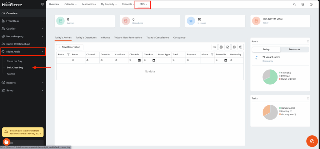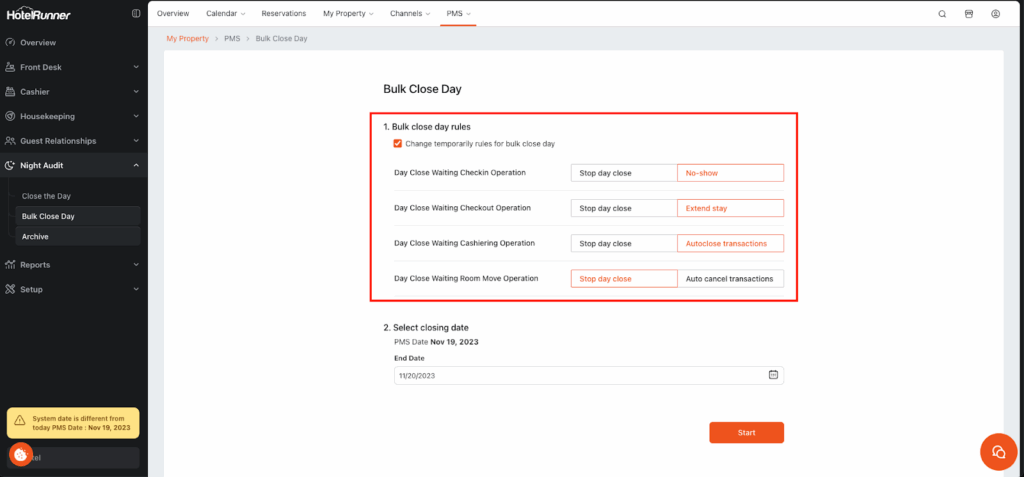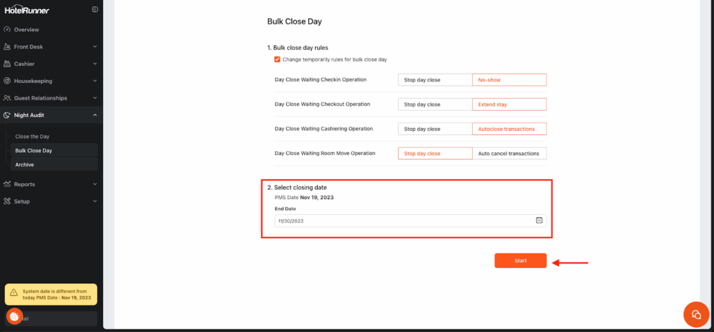 - Navigate to PMS > End of Day > Bulk Close Day.