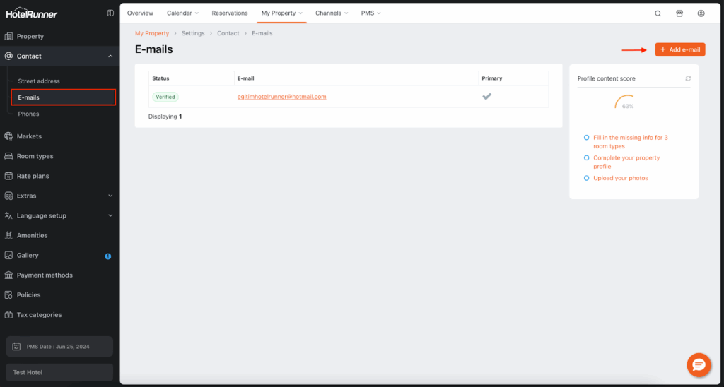 - The primary email address in this field is listed as the contact email address on your property’s website (if provided by HotelRunner) and in the Booking Engine.