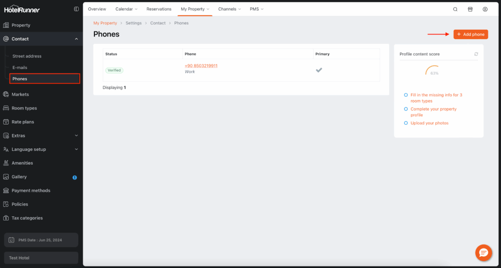 - The primary phone number in this field is listed as the contact phone number on your property’s website (if provided by HotelRunner) and in the Booking Engine.
