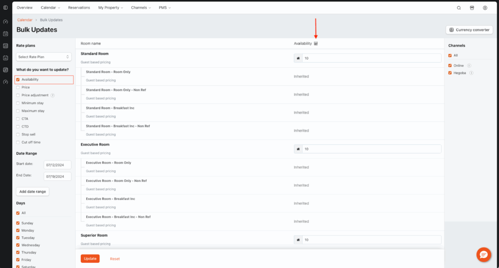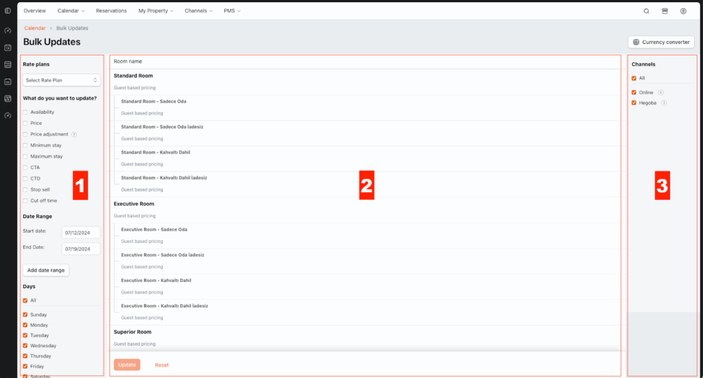 - Update Types and Date Range (Left Panel): This is where you select the core parameters for your update, such as the action to be performed (price, availability, CTA, CTD, etc.), the date range, days of the week, and the rate type.