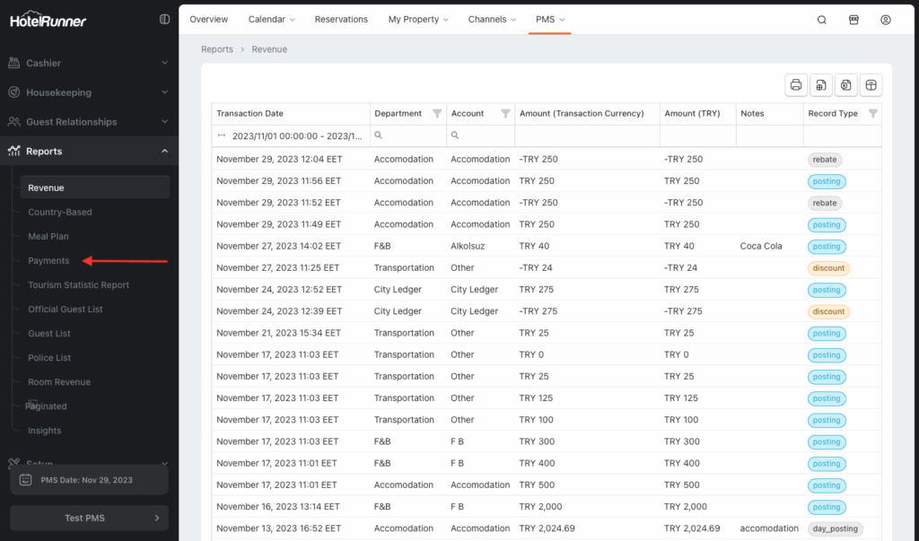 To obtain a detailed payment report for transactions posted on guest folios, navigate to PMS > Reports and select the Payments report.