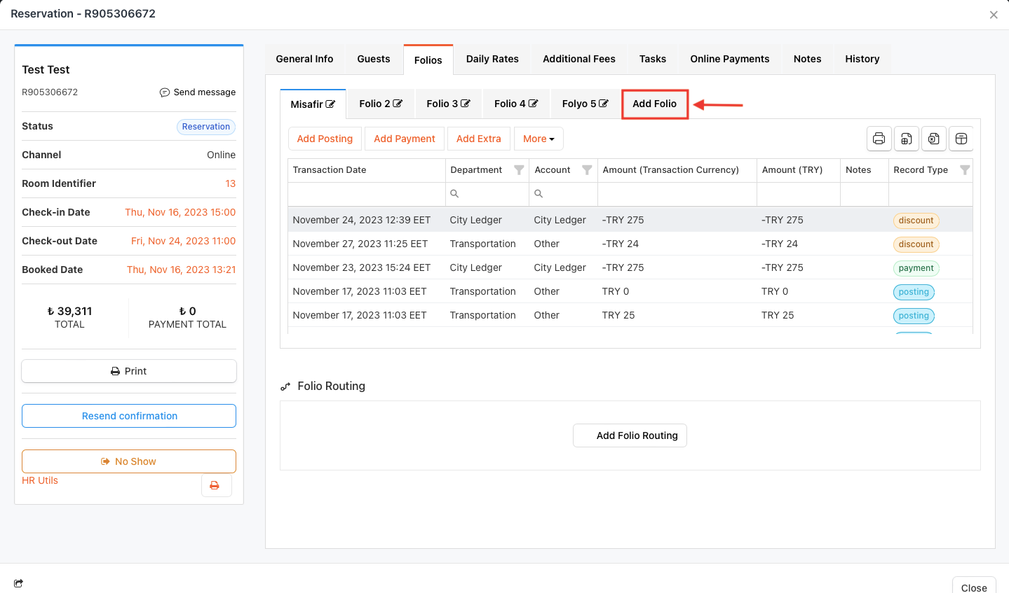 The folio titled Guest is automatically created by the system for each reservation. If you wish to track a guest’s expenses and payments across multiple accounts, you can create a second folio using the Add Folio button. You can add as many folios as you need in this area.