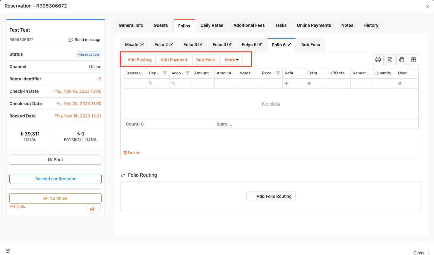 Folios are guest-specific account statements within the reservation. In this area, you can post, edit, and track your guests’ expenses. You can also monitor their payments, remaining balances, and debt/credit statuses.