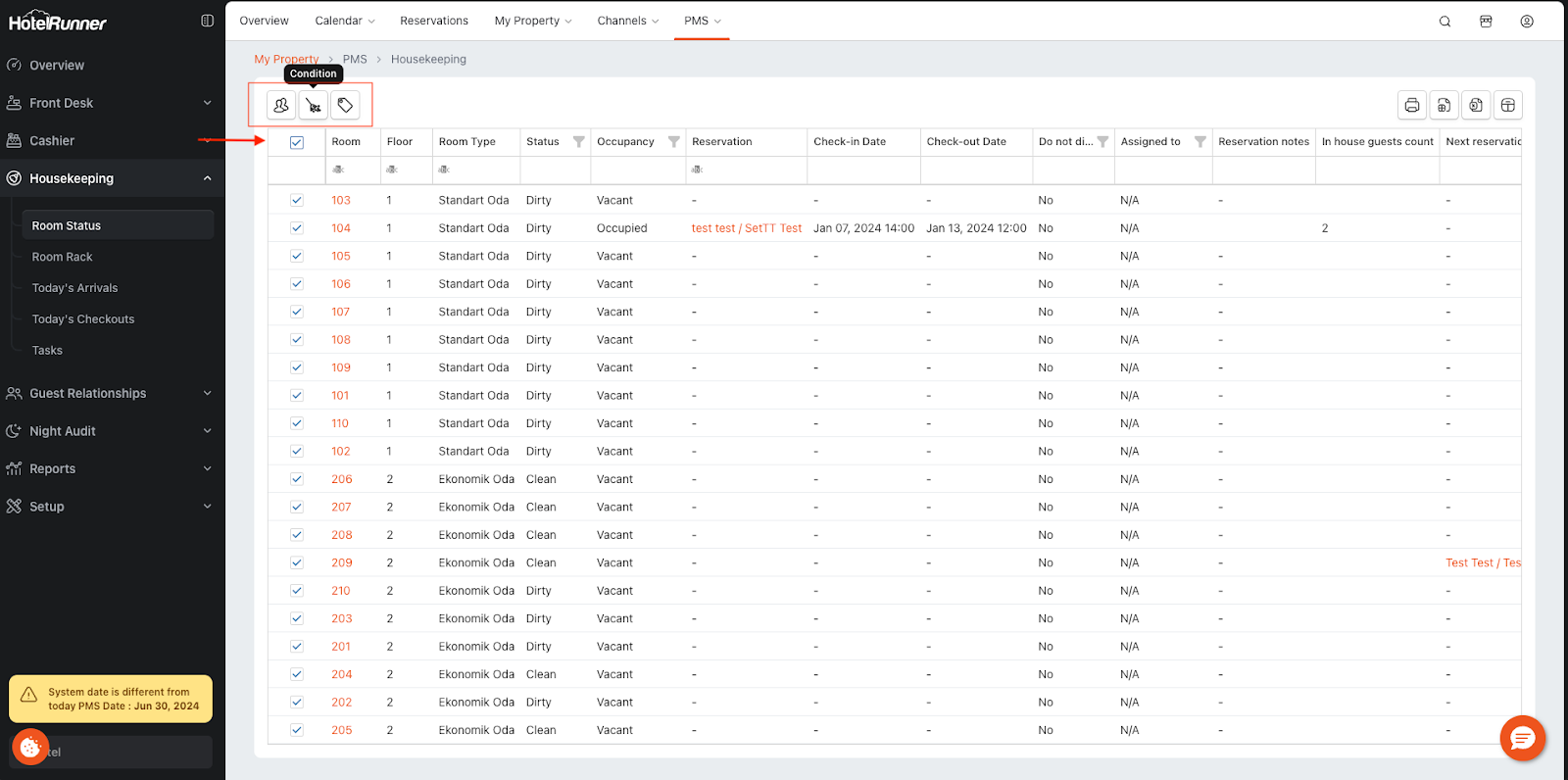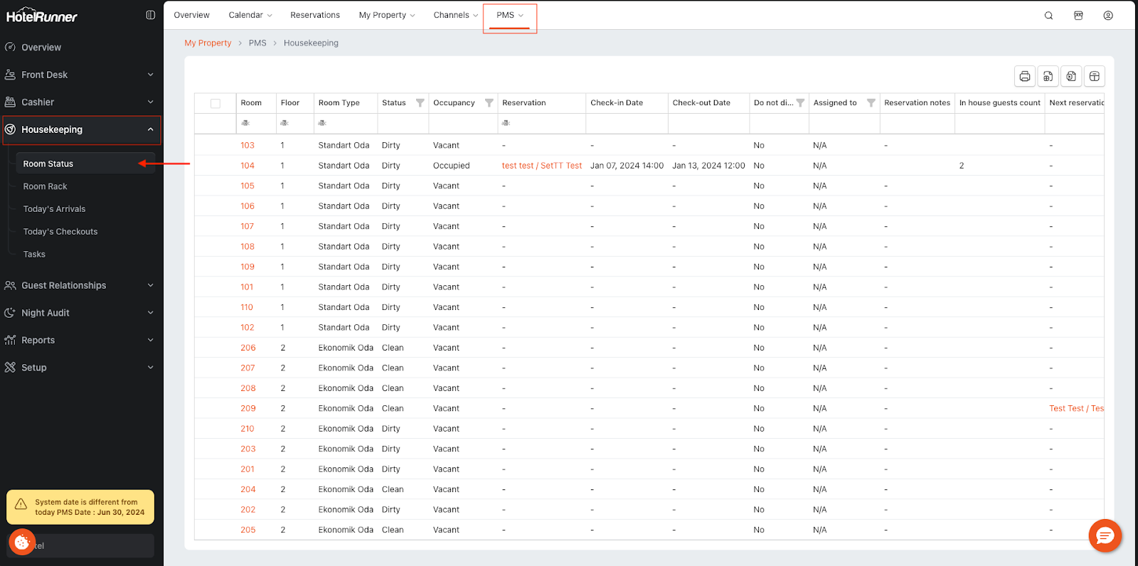 To optimize the management of your Housekeeping operations, you can access the Room Status screen, which offers a detailed and customizable overview of room conditions based on your chosen parameters. This tool enables you to efficiently monitor and update room statuses, ensuring a seamless and well-coordinated workflow. To utilize this feature, navigate to PMS > Housekeeping > Room Status.