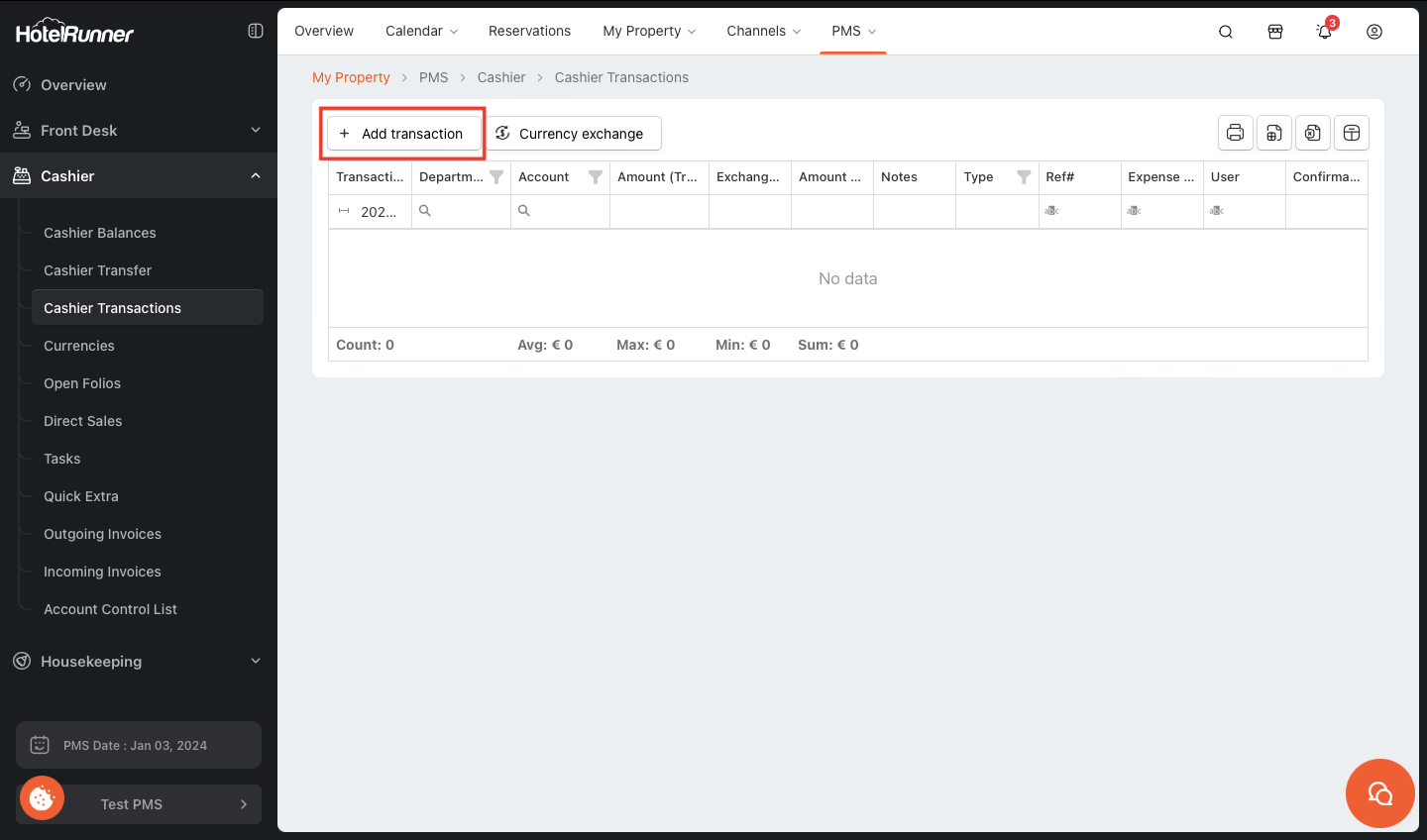 You can view all payment transactions performed for a selected date range from the Cash Movements field. You can access the Cash Movements area from PMS > Cashier > Cashier Transactions.