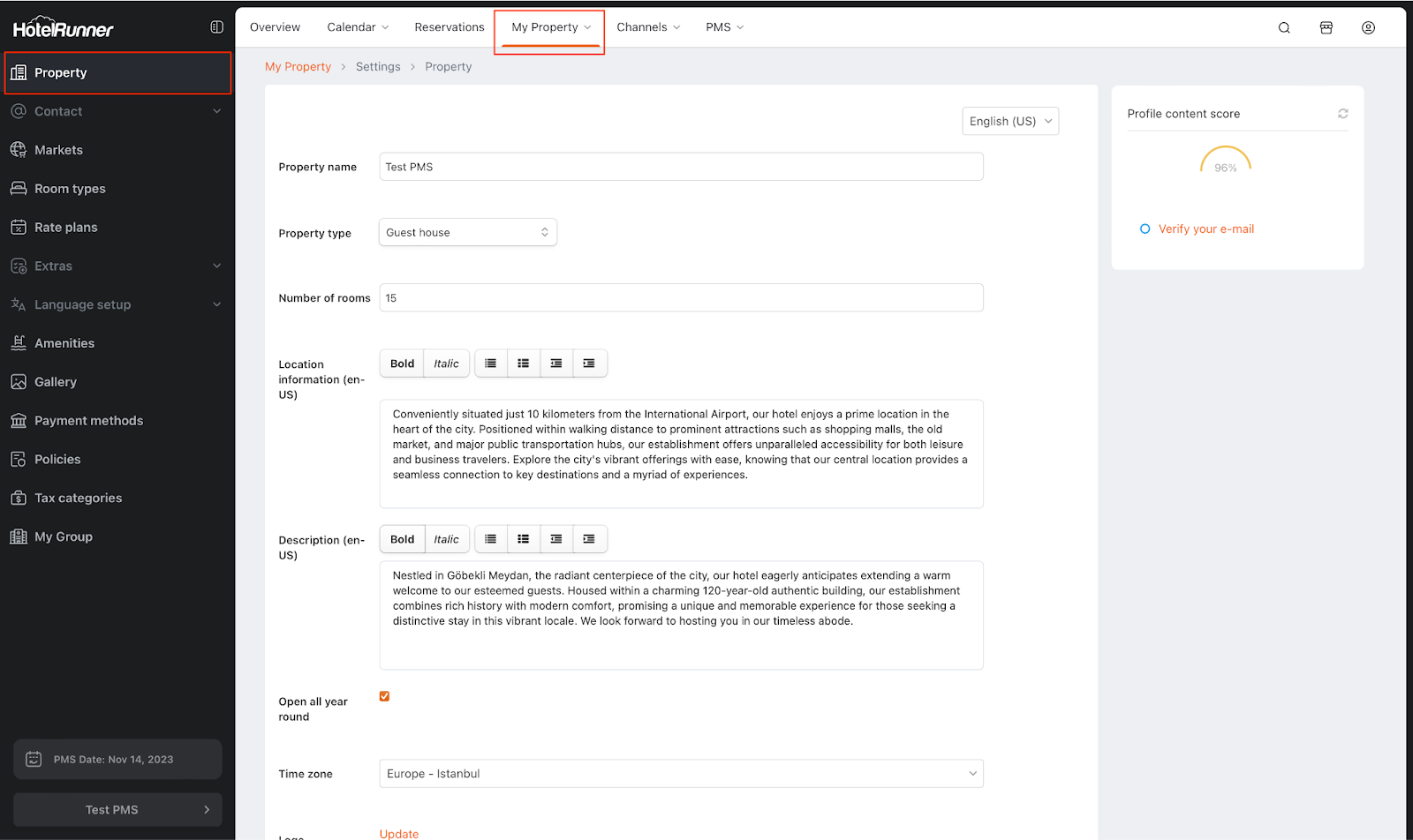 The Property Profile is where you define fundamental details about your property (name, room count, location, description, etc.) in the HotelRunner panel. The information entered here directly influences the Booking Engine and your website, making it crucial for a positive guest experience, operational efficiency, and your brand image.