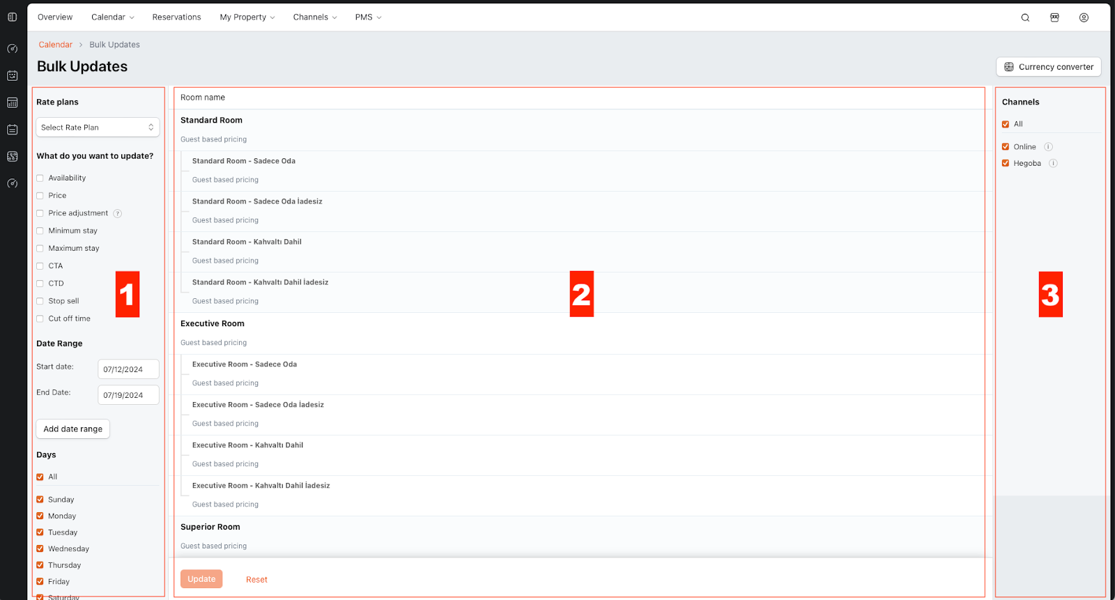 - Update Types and Date Range (Left Panel): This is where you select the core parameters for your update, such as the action to be performed (price, availability, CTA, CTD, etc.), the date range, days of the week, and the rate type.
