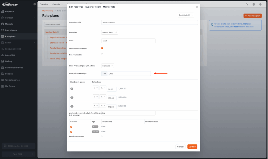 Placement: Generally, this field is visible under the Master Rate for the associated room types. For properties managing prices independently of the Master Rate, it can be active under each Rate Plans associated rooms.