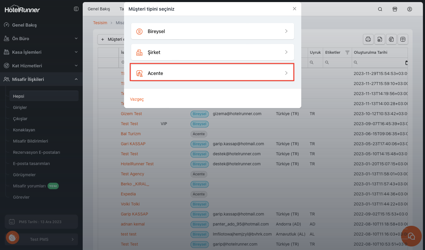 HotelRunner PMS üzerinde oluşturulan tüm profilleri PMS > Misafir İlişkileri > Hepsi ekranından görüntüleyip düzenleyebilir, ve rezervasyonlardan bağımsız olarak yeni bir profili ekleyebilirsiniz.