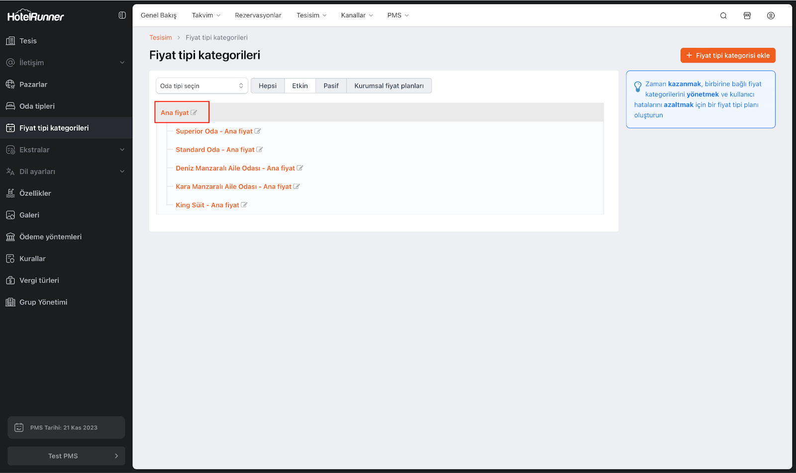Ana Fiyat (Master Rate), tüm diğer fiyatlandırma seçeneklerinin temelini oluşturan varsayılan fiyat tipidir. İşletmenizde sunulacak olan diğer fiyatlar bu temel fiyat üzerine inşa edilir. Oda tipleri oluşturulduğuna, her bir oda tipi için Ana Fiyat altında alan açılmaktadır.