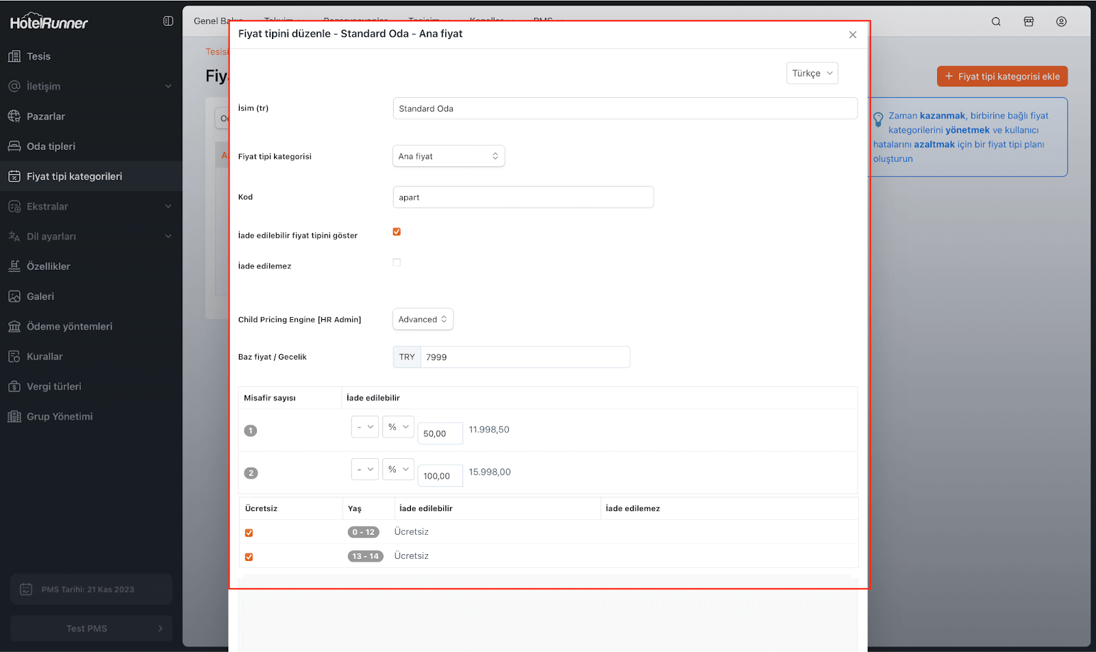 - Ana Fiyat başlığının altındaki her bir oda tipini tıkladığınızda o odaya ait ayarlamaları yapabilirsiniz.