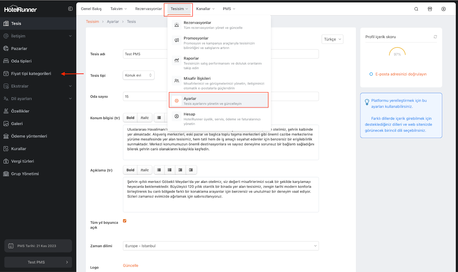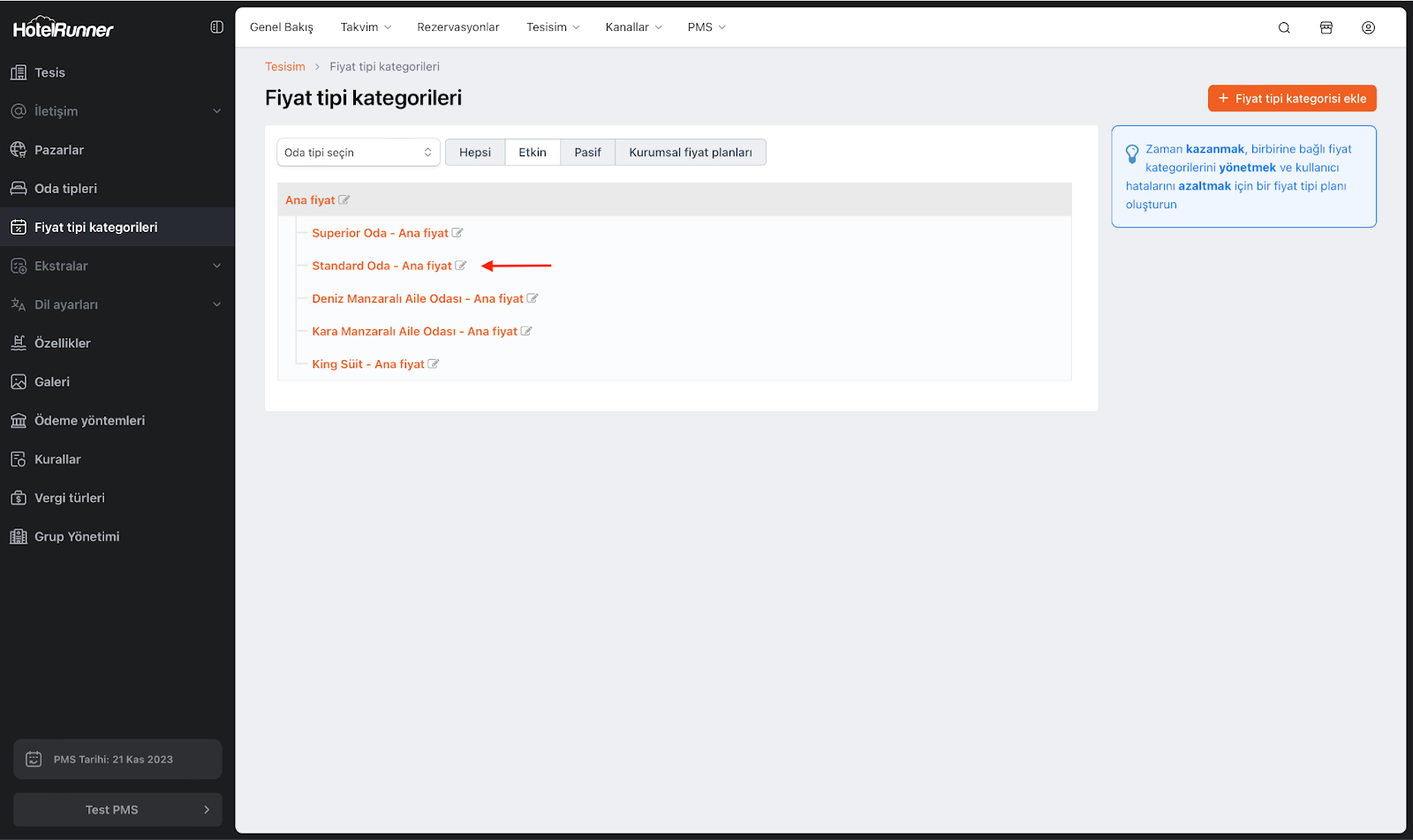 - Tesisim > Ayarlar > Fiyat Tipi Kategorileri üzerinden fiyat tipi kategorilerine bağlı oda tiplerinden tıklanarak bu alan görüntülenebilir.