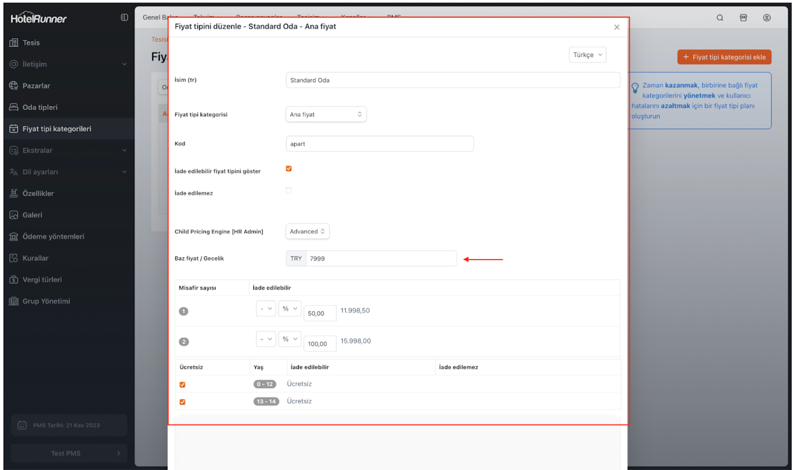 Fiyat Tipi Kategorileri Ekranında Baz Fiyat / Gecelik Alanını Görüntüleme