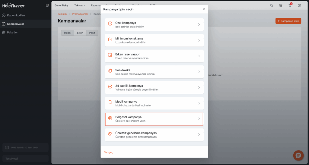 Bölgesel Kampanya, sadece Rezervasyon Modülü üzerinden sunulan, belirli bölgeler veya ülkelerden gelen misafirleri hedefleyen bir promosyondur.