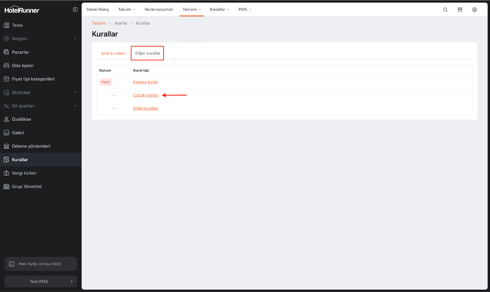 1. Tesisim > Ayarlar > Kurallar ekranını açın.