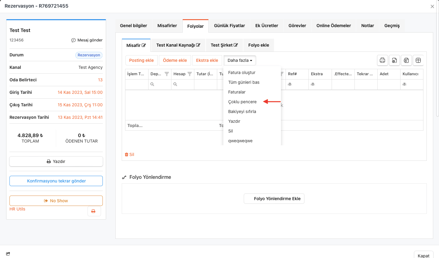 HotelRunner PMS’de, rezervasyon içerisinde oluşturulan tüm folyoları aynı anda ve tek bir ekranda çoklu olarak görüntüleyip yönetmek için Çoklu Pencere özelliği geliştirilmiştir.