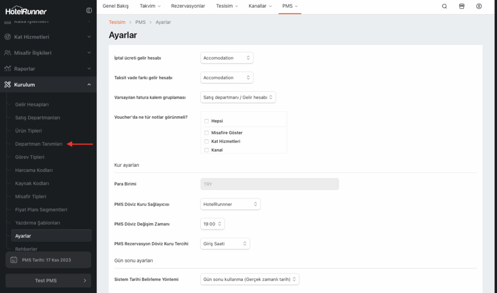 - Varsayılan Departmanlar: Kasa İşlemleri, Ön Büro, Kat Hizmetleri, Muhasebe, Misafir İlişkileri ve Diğer departmanları HotelRunner PMS Kurulum alanında otomatik olarak bulunmaktadır.