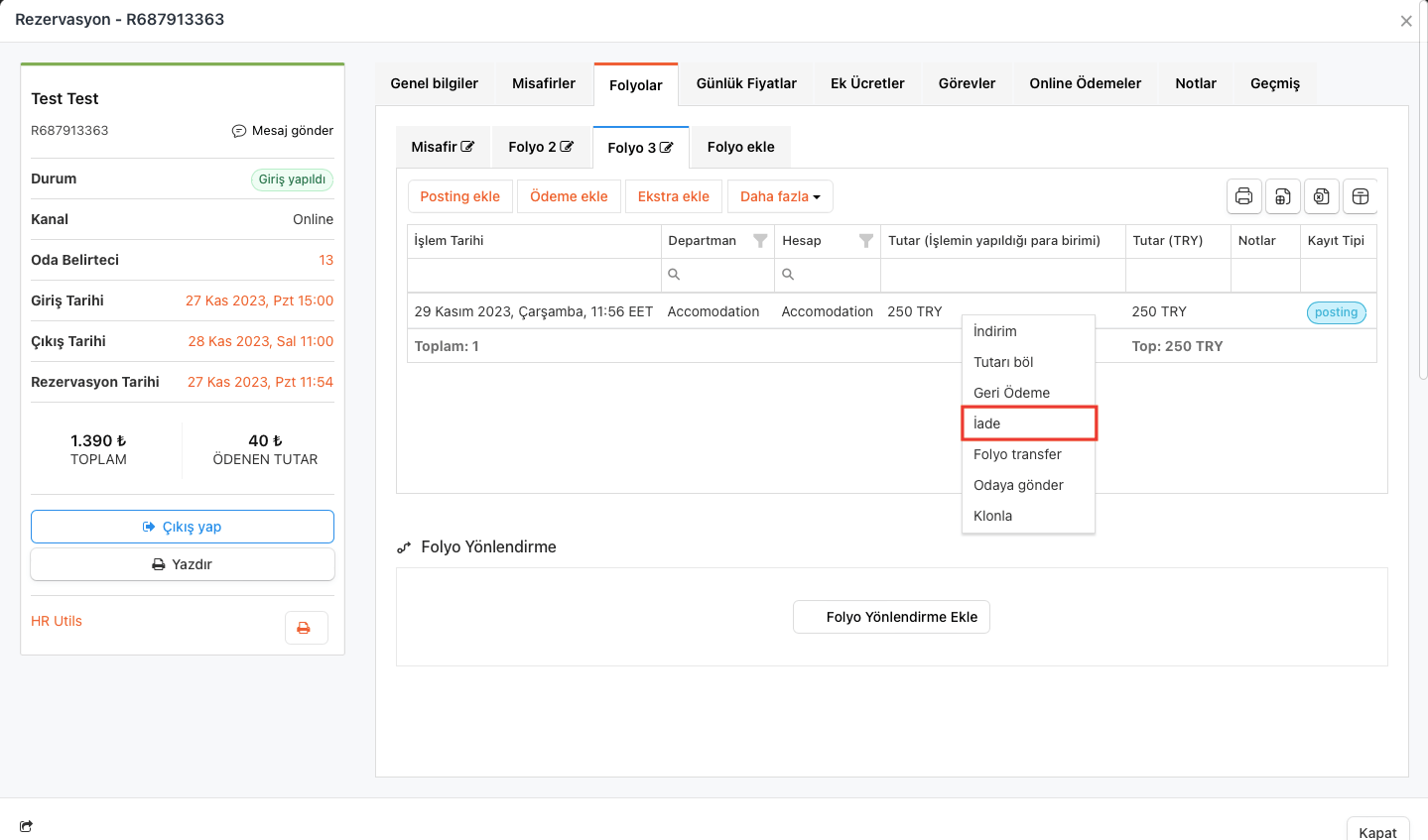 🔔 Not: Folyo ekranında birden çok işlem kalemi varsa, yapılacak işlemlerin karıştırılmaması adına iade işlemi yapılacak gelir kalemini yeni folyoya aktarıp o folyoda işlem yapmak daha faydalı olacaktır. Folyo transfer işlemleri için “Folyo Ekranındaki Folyo Transfer Seçeneği Nasıl Kullanılır?” dökümanını inceleyebilirsiniz.