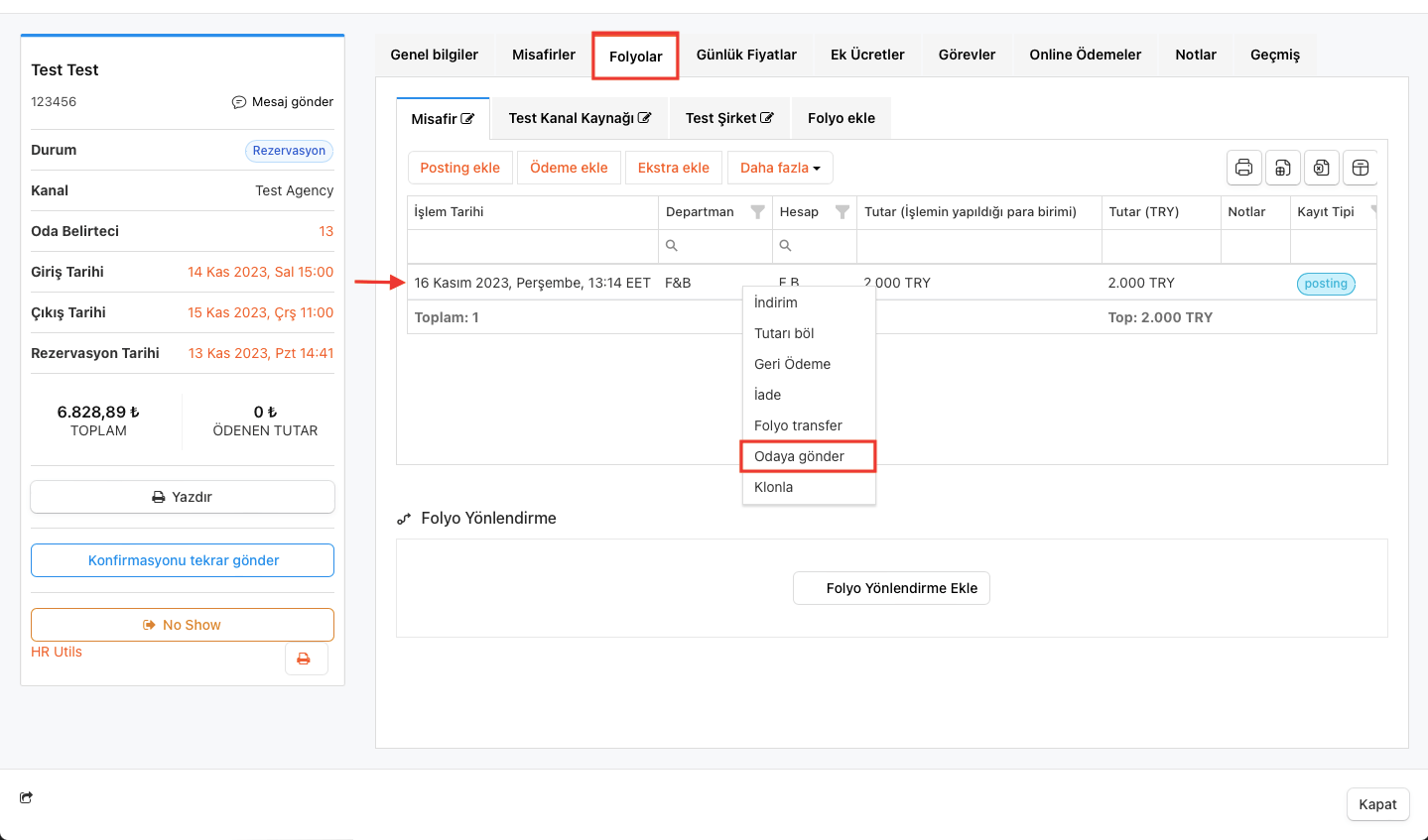 Misafir hesabına işlenmiş olan bir işlem kalemini farklı bir odaya göndermek için Odaya gönder seçeneğini kullanabilirsiniz.