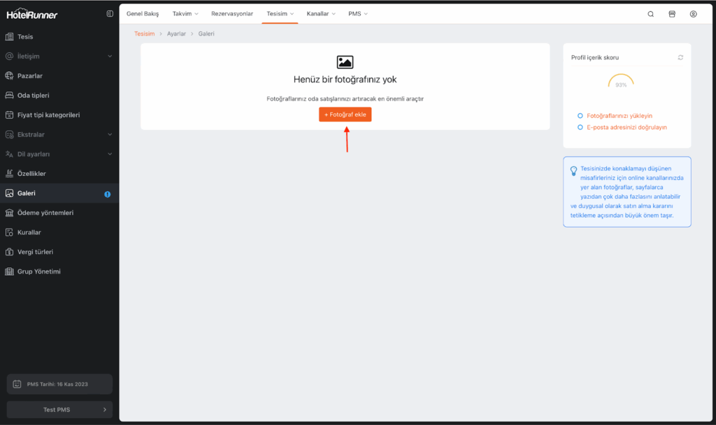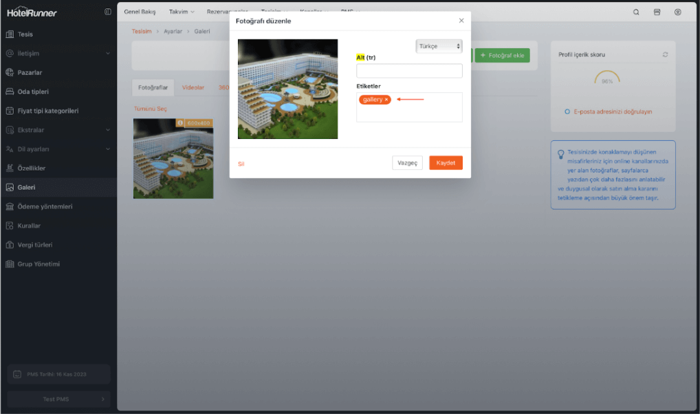 • Galeriye eklenen tüm dosyalar; tesisin dış görünümü, genel alanlar, yeme-içme alanları ve sosyal alanlar gibi bölümleri kapsamalıdır. Oda görselleri bu alandan eklenmez.