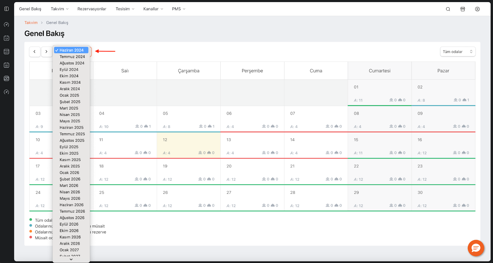 Genel Bakış sayfası, işletmenizin rezervasyon ve müsaitlik durumlarını ay bazlı bir takvim üzerinde hızlıca görebilmenizi sağlayan bir arayüzdür.