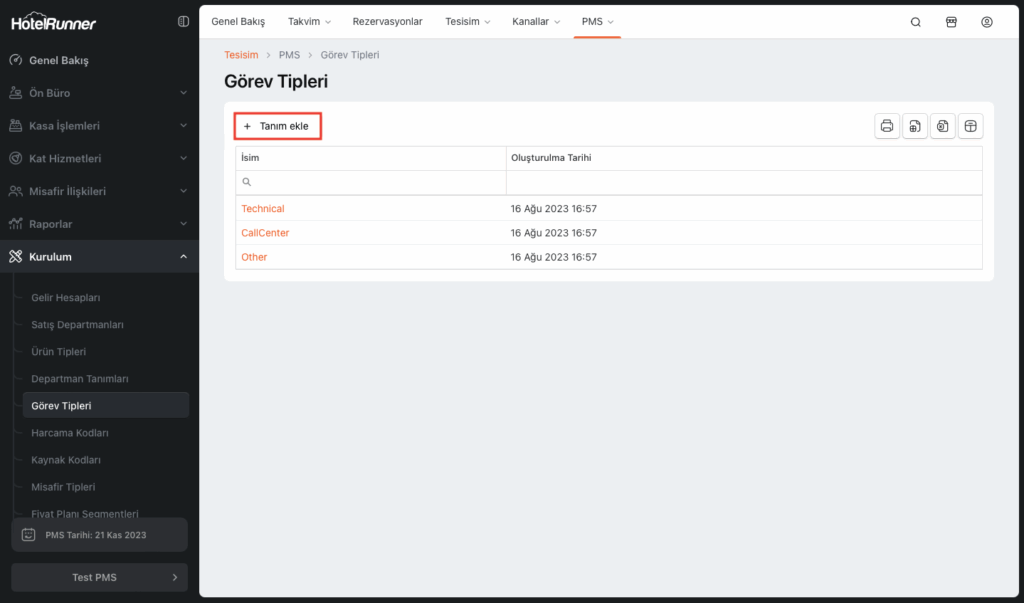 Görev Tipleri ekranına PMS > Kurulum > Görev Tipleri uzantısından erişebilirsiniz.