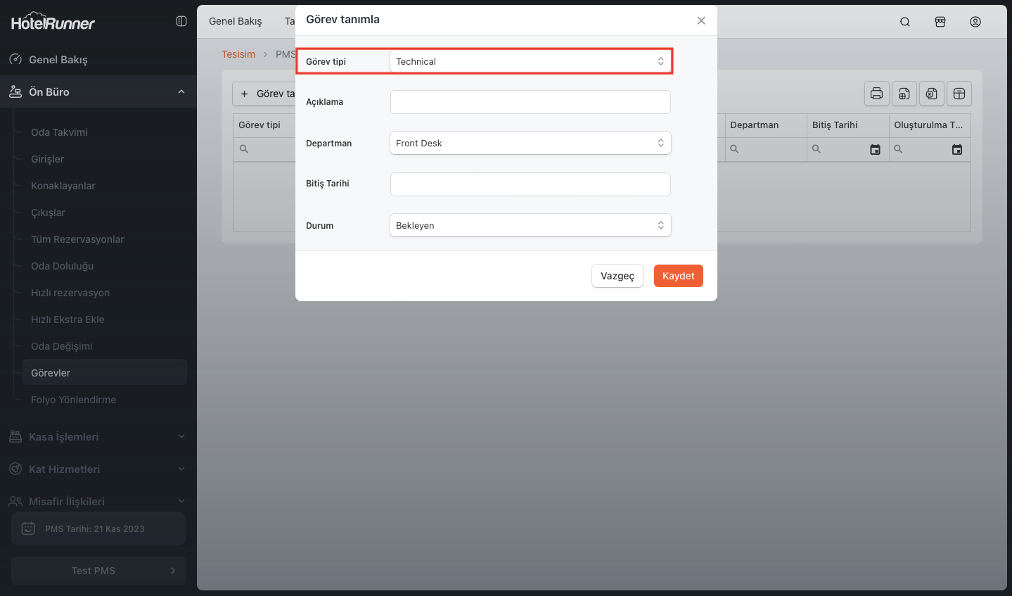 🔔 Not: PMS > Ön Büro > Görevler uzantısından gerçekleştireceğiniz yeni görev ataması işlemlerinde Görev tipi seçimi aşamasında, Görev Tipleri alanında oluşturduğunuz görev tipleri karşınıza çıkacaktır.