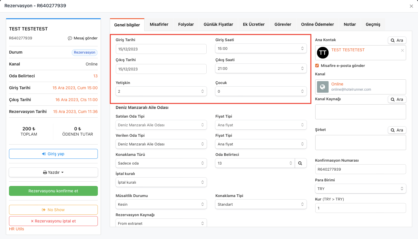 Bu işlem sonrasında sistem çıkış tarihini PMS giriş tarihi ile aynı gün olarak kaydedilmesine izin verecektir. Giriş ve çıkış tarihini aynı gün olarak güncelleyin.