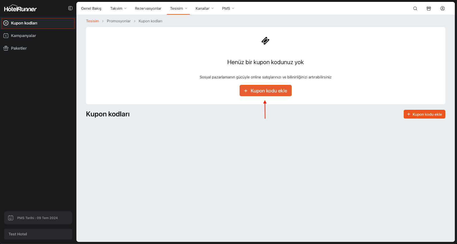 - HotelRunner panelinde Tesisim > Promosyonlar sekmesini açın.