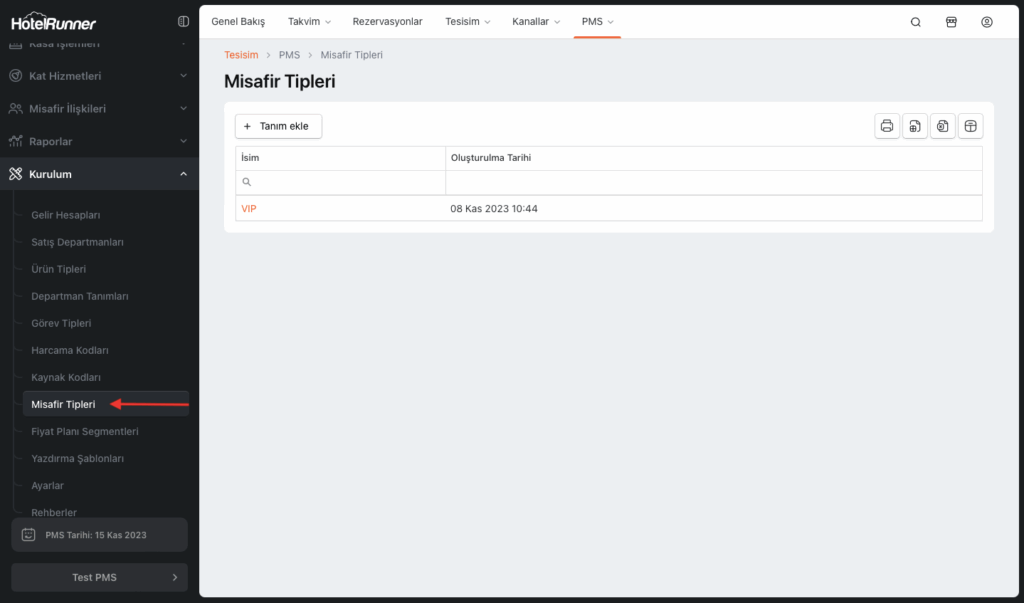 Misafir Tipleri ekranına PMS > Kurulum > Misafir Tipleri üzerinden erişebilirsiniz.