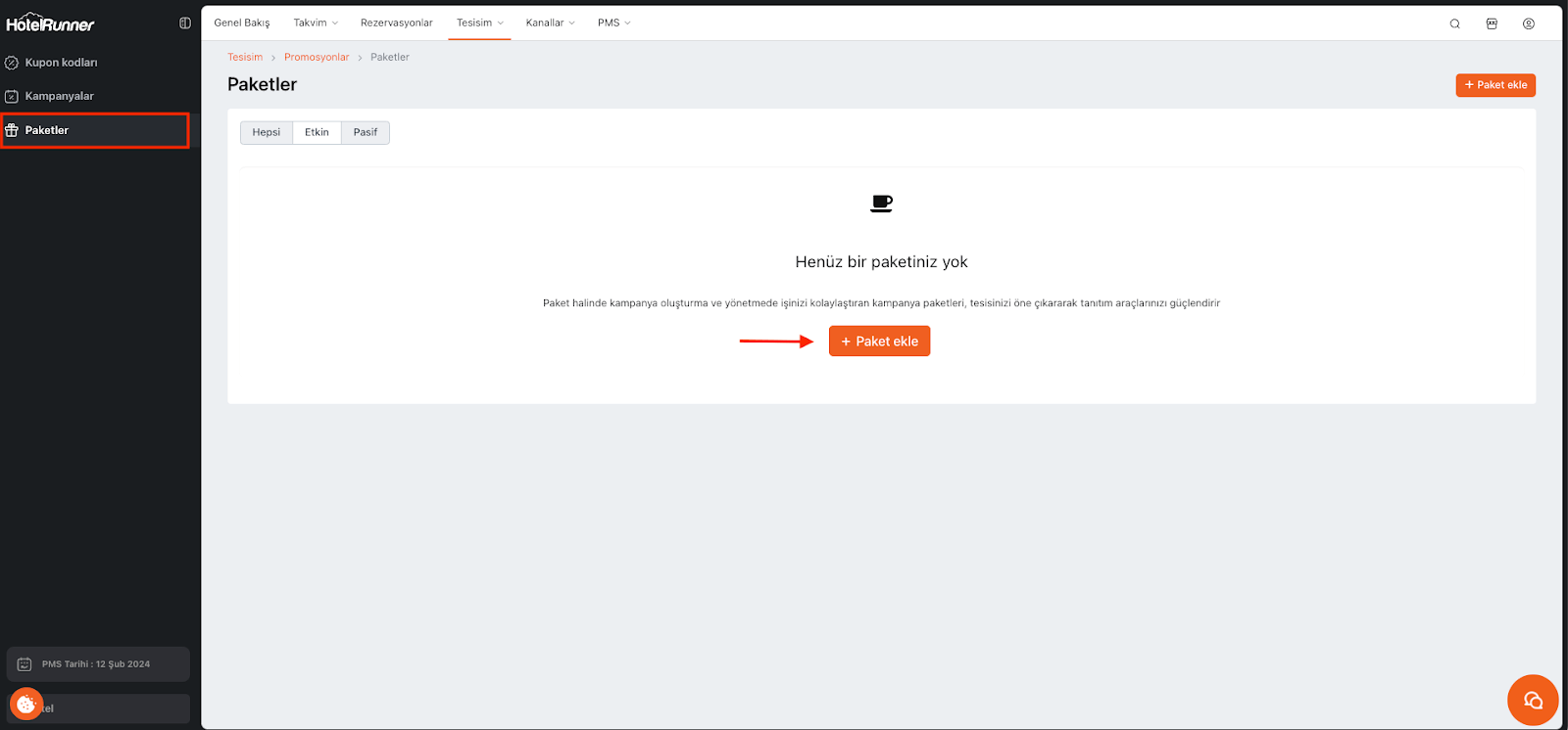 HotelRunner panelinde kampanyalar Promosyonlar menüsünden, konaklama + ekstra kombinasyonları ise Paketler menüsünden yönetilmektedir.