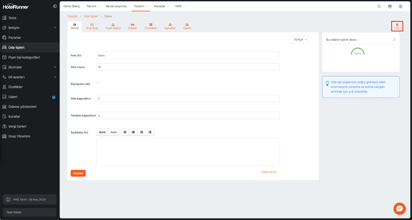 • Tesisim > Ayarlar > Oda tipleri ekranından silmek istediğiniz oda tipini açın.